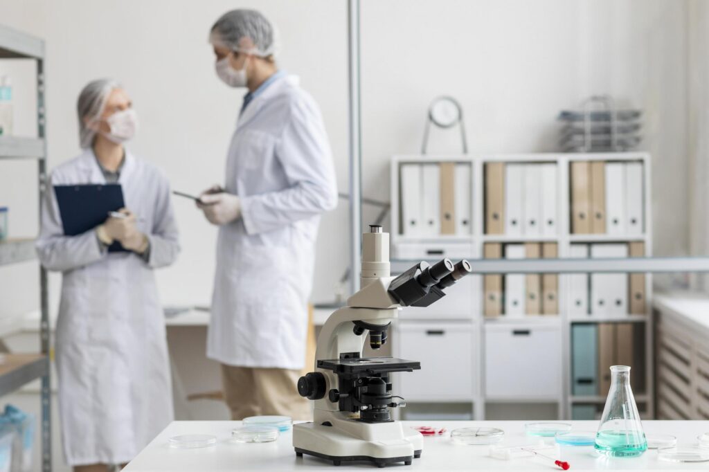 Close up of researcher testing liquid sample using micropipette for new treatment medical laboratory. Team of doctors examining virus evolution using high tech for vaccine development against covid19