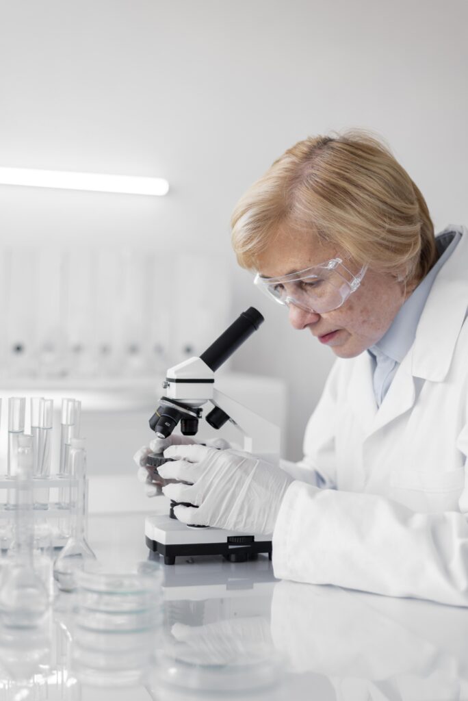 Female medical or scientific researcher or woman doctor looking at a test tube of clear solution in a laboratory.