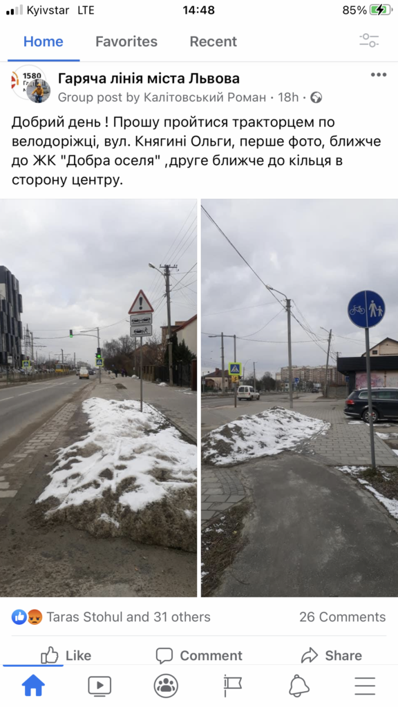 Як йдеться у повідомленні, потрібно почистити велодоріжку на вулиці Княгині Ольги поблизу “Доброї оселі”.