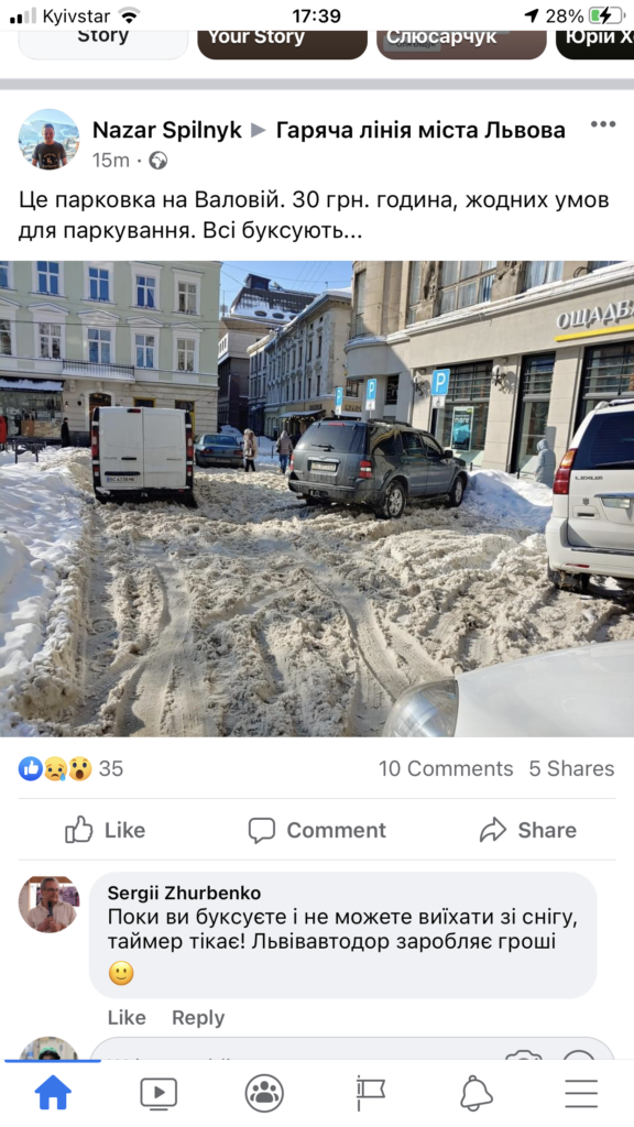 “Це парковка на Валовій. 30 грн. година, жодних умов для паркування. Всі буксують…”, – йдеться у повідомленні.