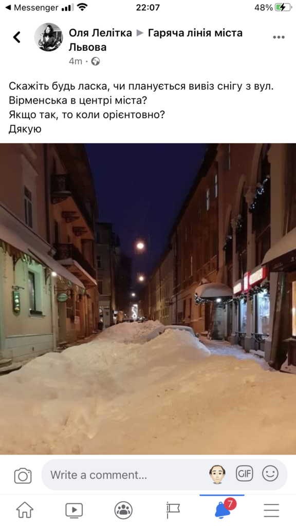 Як йдеться у повідомленні, дівчина запитує, чи планується вивіз снігу з вулиці Вірменської у центрі міста і, якщо так, то коли.