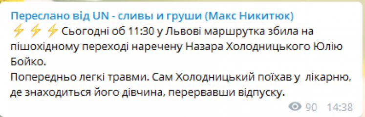 “Сьогодні об 11:30 у Львові маршрутка збила на пішохідному переході наречену Назара Холодницького Юлію Бойко. Попередньо легкі травми. Сам Холодницький поїхав у лікарню, де знаходиться його дівчина, перервавши відпуску”, – йдеться у повідомленні.