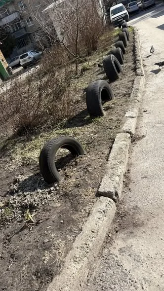 Прошу, щоб відповідальна організація, яка відповідає за цю територію, прибрали шини. По перше, це не естетично виглядає, а по друге, під променями сонця виділяє шкідливі речовини