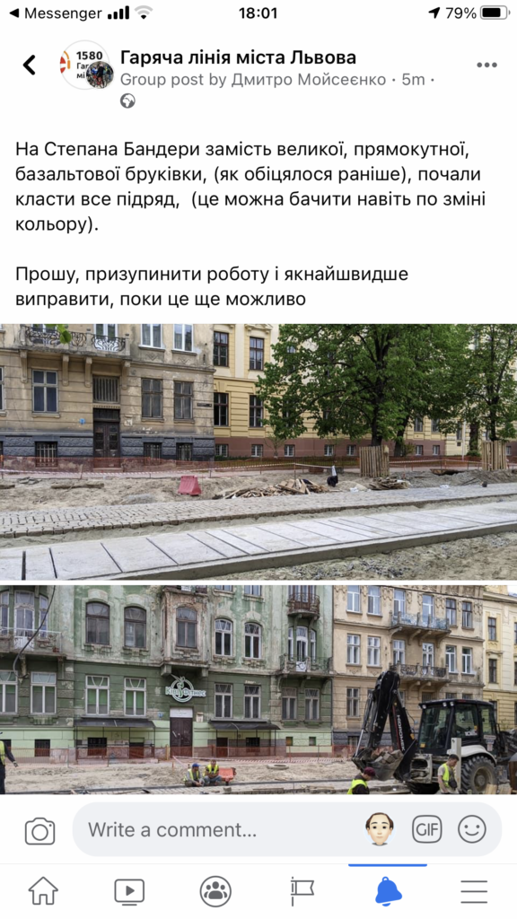 У Львові на вулиці Степана Бандери кладуть не ту бруківку. Фото Гаряча лінія міста Львова, скрін допису