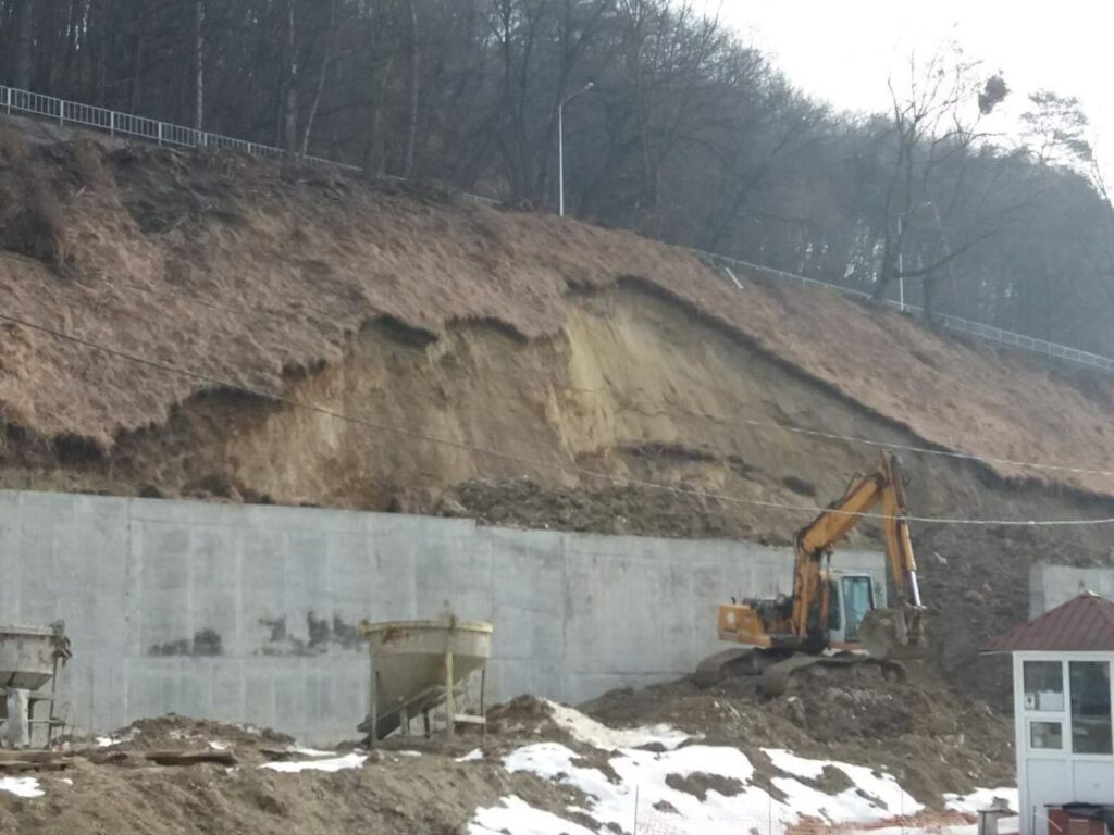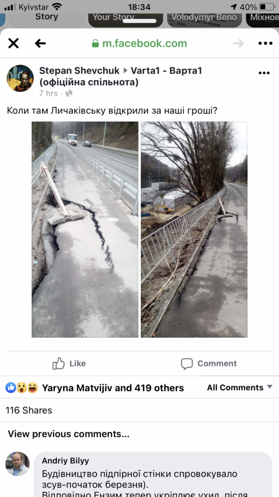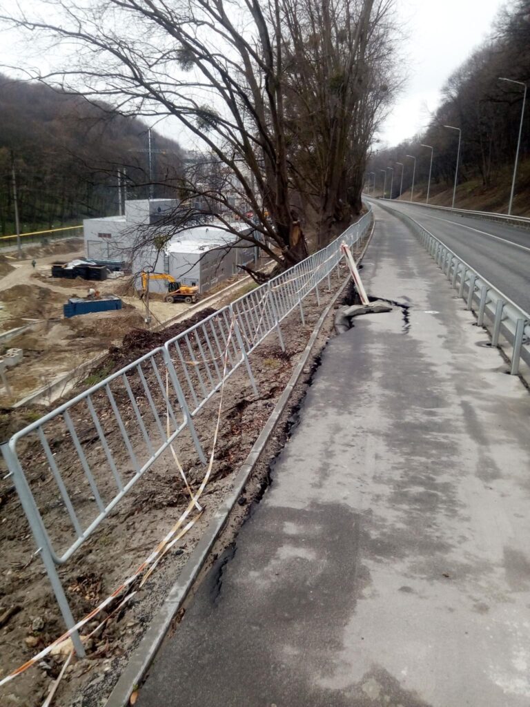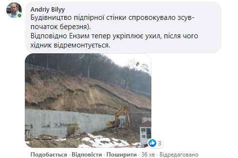 «Будівництво підпірної стінки спровокувало зсув (початок березня). Відповідно Ензим тепер укріплює ухил, після чого хідник відремонтується», – зазначає Білий.
