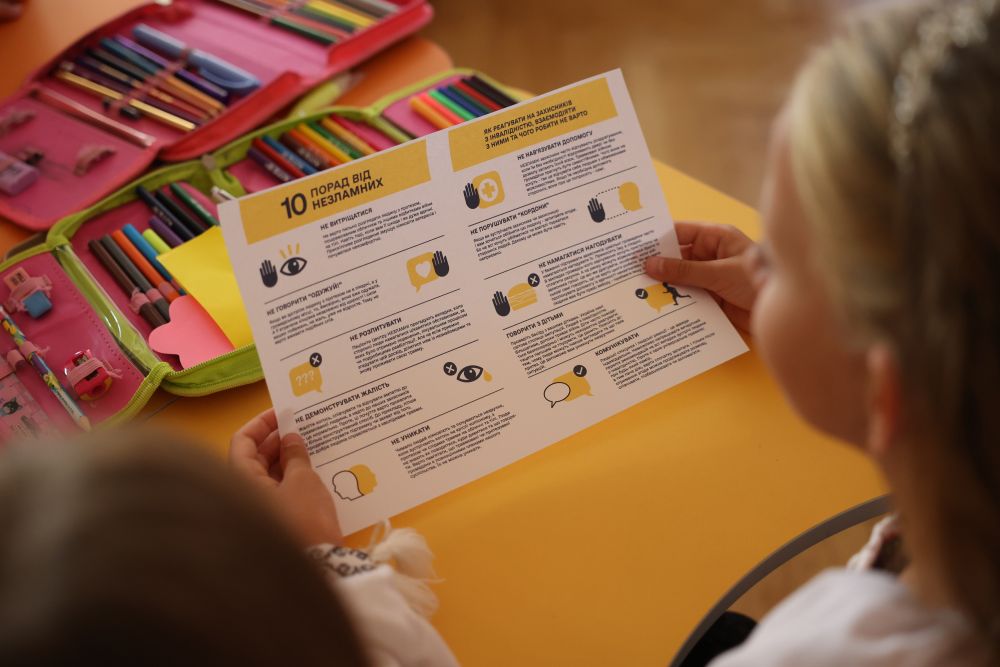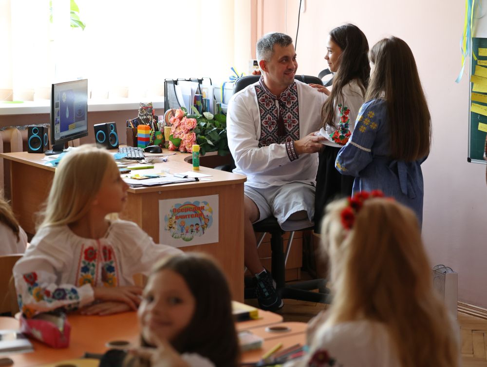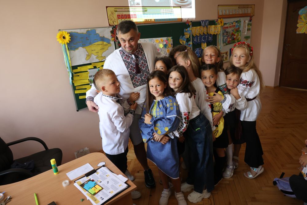 Під час уроку Михайло допомагав учням створювати плакат, відповідав на запитання, розповідав про себе та багато обіймався з дітьми.