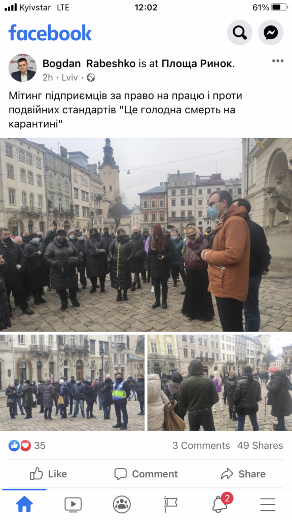 «Мітинг підприємців за право на працю і проти подвійних стандартів “Це голодна смерть на карантині”», – написав Рабешко.