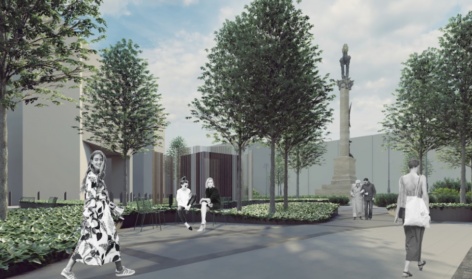 Для цього одну зі смуг руху ліквідують і перенесуть як додаткову перед пам’ятником. Відтак площа, де зараз є автостоянка та смітники, буде пішохідною і тягнутиметься аж до готелю на вул. Театральній. А самі смітники планують зробити підземними.