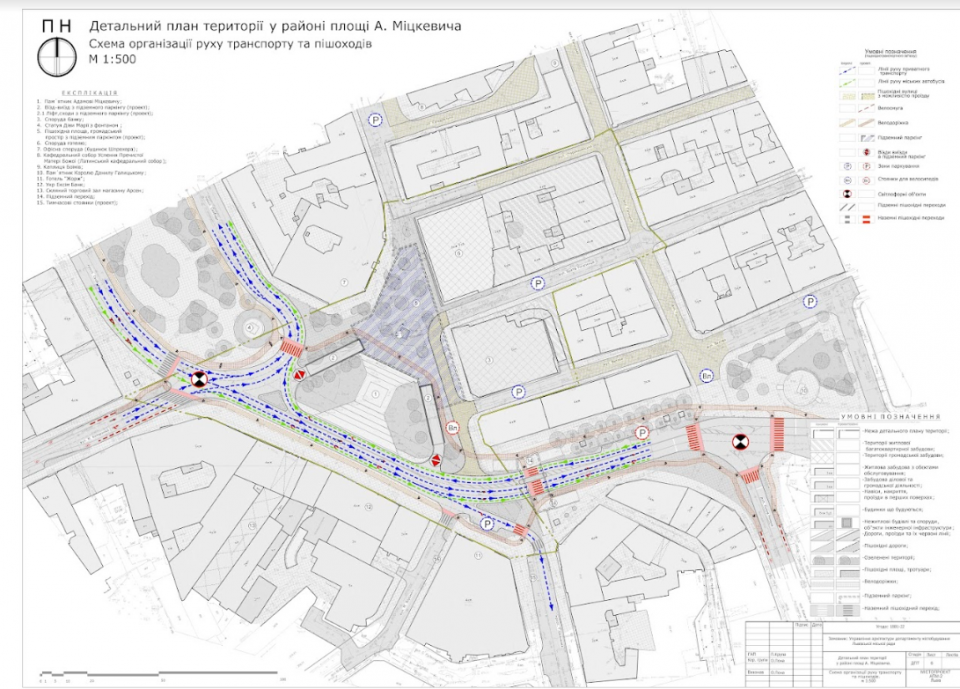 Тиждень тому в мережі з’явився детальний план території, який охоплює площу 1,66 га довкола площі Адама Міцкевича. Згідно із цією візуалізацією, створеною ЛКП “Інститут просторового розвитку”, ліворуч від пам’ятника планують зробити заїзд до підземного паркінгу, а з правого боку – виїзд.