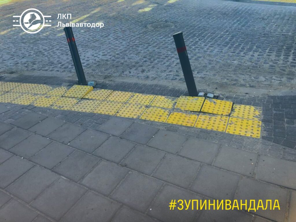 У Львові пошкодили антипаркувальні стовпці і тактильну плитку на реконструйованій ділянці перехрестя вул. Шевченка – Турянського.