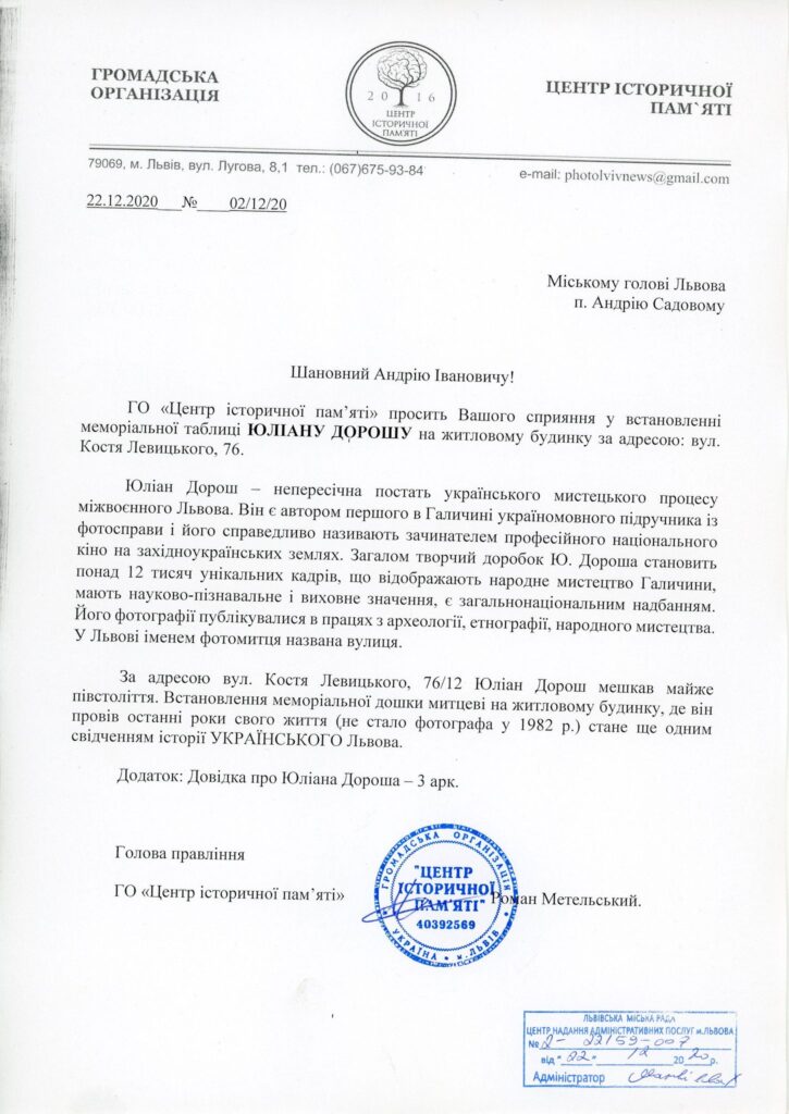 За адресою вул. Костя Левицького, 76/12 Юліан Дорош мешкав майже півстоліття. Встановлення меморіальної дошки митцеві на житловому будинку, де він провів останні роки свого життя (не стало фотографа у 1982 р.) стане ще одним свідченням історії УКРАЇНСЬКОГО Львова.
