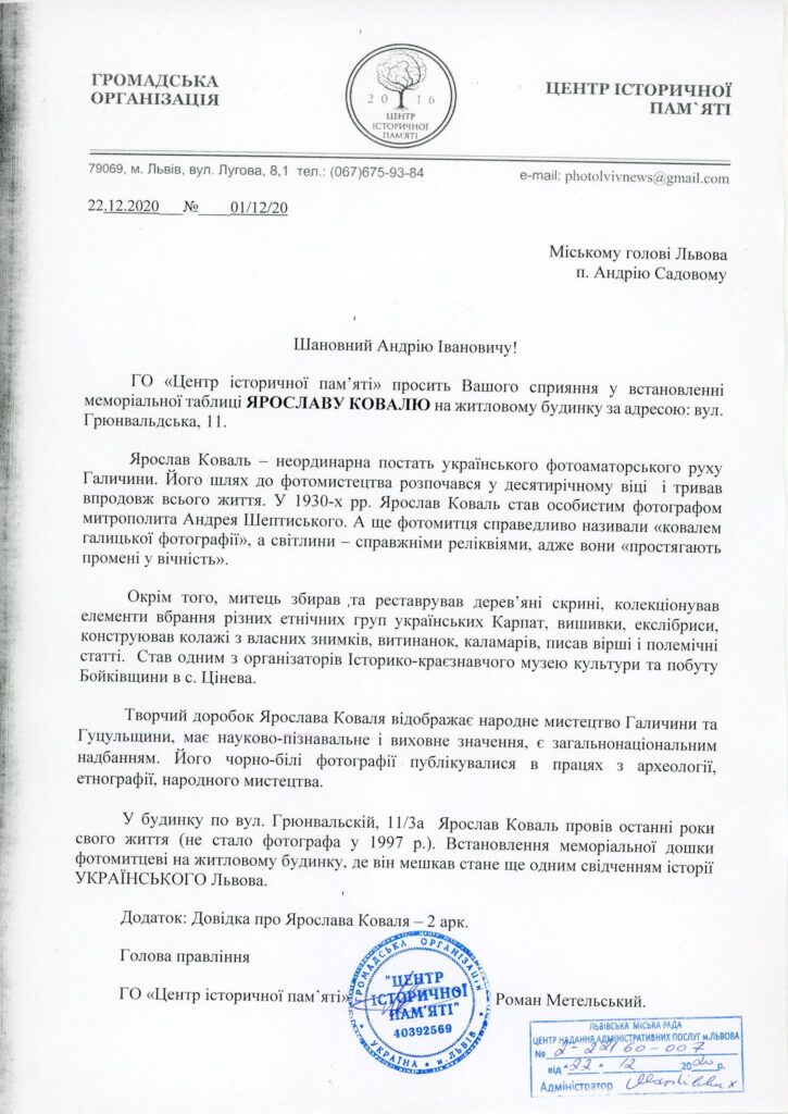 «У будинку по вул. Грюнвальскій, 11/3а Ярослав Коваль провів останні роки свого життя (не стало фотографа у 1997 р.). Встановлення меморіальної дошки фотомитцеві на житловому будинку, де він мешкав стане ще одним свідченням історії українського Львова», – йдеться у листі до мера Львова за підписом Романа Метнельського.