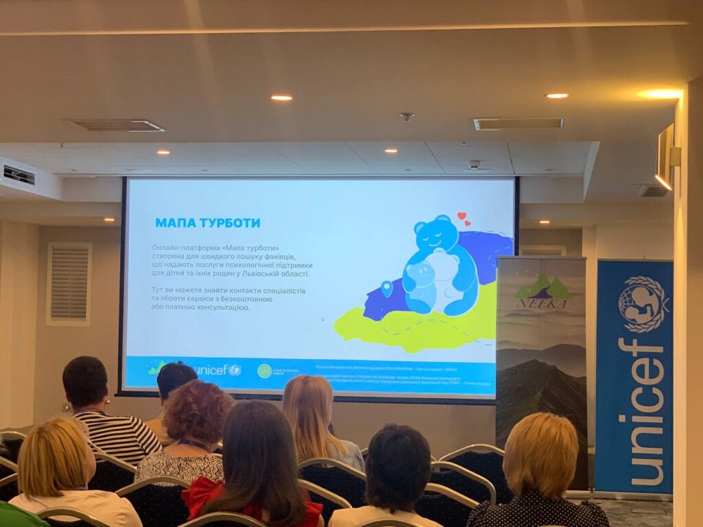 Вона також розповідала про психічне благополуччя і продемонструвала онлайн-платформу «Мапа Турботи». Це платформа для швидкого та ефективного пошуку спеціалістів у царині психологічного здоров‘я, де кожен охочий у Львівській області може підібрати собі фахівця відповідного профілю.