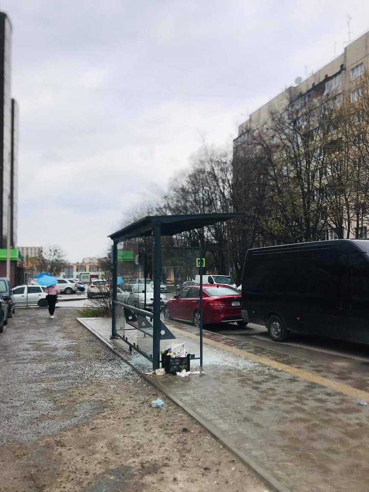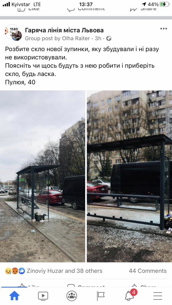 «Розбите скло нової зупинки, яку збудували і ні разу не використовували. Поясніть чи щось будуть з нею робити і приберіть скло, будь ласка.