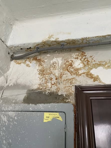 “На вулиці Хвильового 25 тече дах, так як в підʼїзді на (4підізд) 5 поверсі мокрі стіни. Боюсь щоб не закоротило електрику. Нехай б ЖЕК подивився, що там робиться на горі та і у підʼїзді це почистив зробив б вигляд нормальний”, – йдеться у повідомленні.