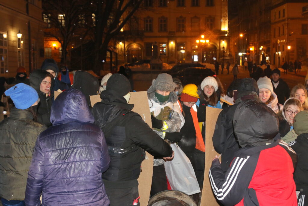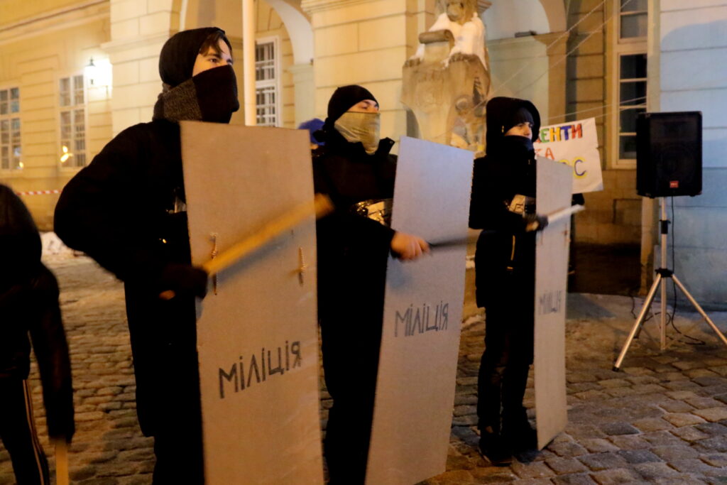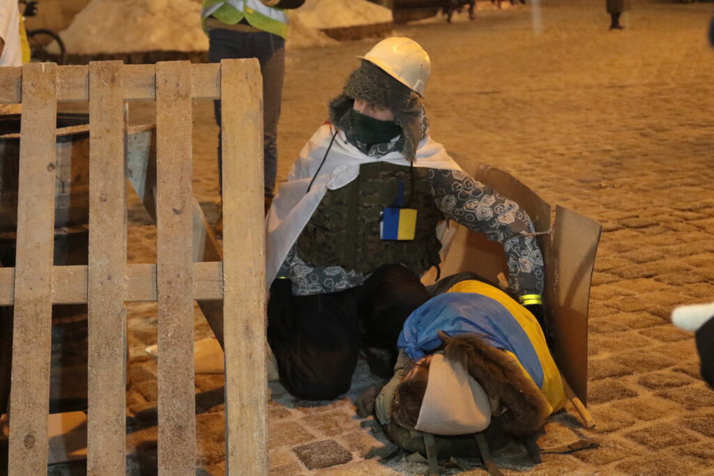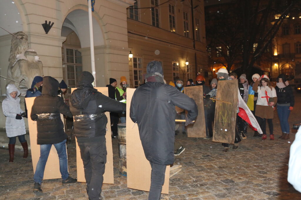 Близько 40 волонтерів відтворювали події 2014 року, коли після тривалих перепалок мітингарів відтіснили на Майдан і в ніч із 18 на 19 лютого розпочався штурм — силовики напали на мітингарів.