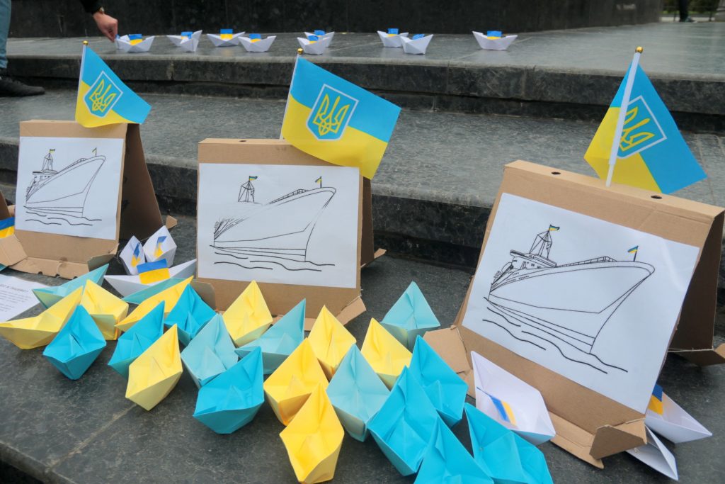 До акції долучись активісти, які прийшли на подію з синіми та жовтими корабликми, плакатами, а також тримали у руках портрети з короткою інформацією про кожного з моряків.