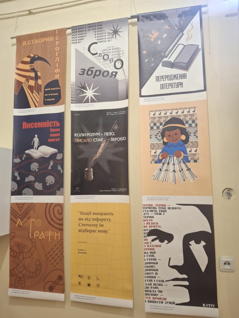 Також на виставці присутні роботи студентів 3 курсу НУ “Львівська політехніка”, що здобувають освіту за програмою “Графічний дизайн”. Їхні роботи передають історичний контекст слова, його силу та красу.