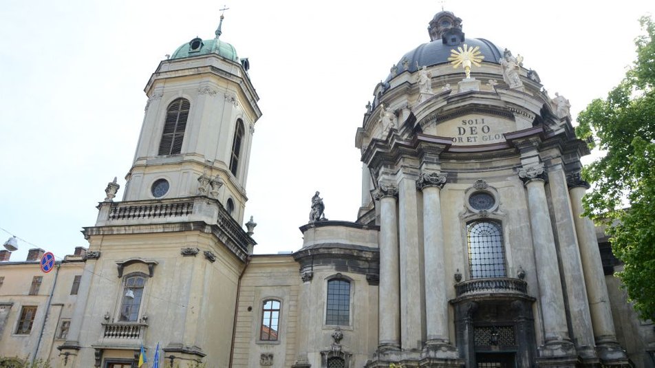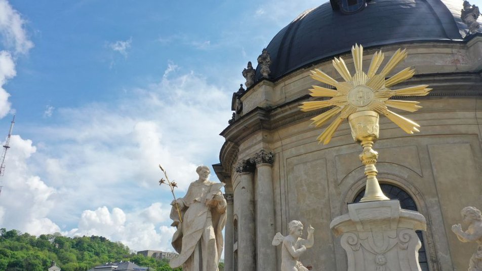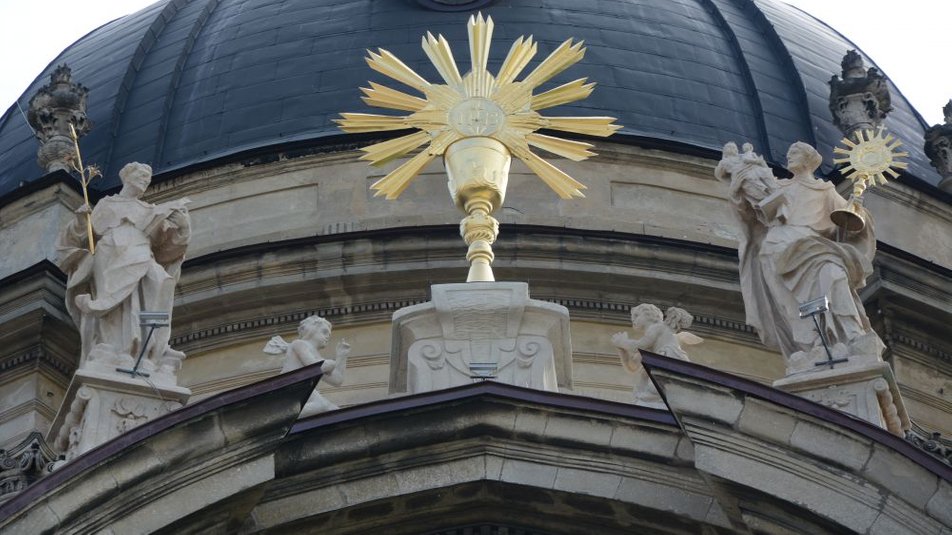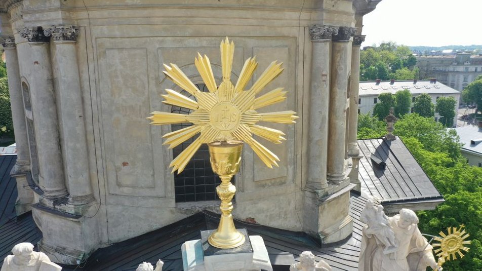 У Львові відреставрували скульптури та чашу на фасаді Домініканського собору. Реставраційні роботи у храмі тривають вже 4 роки.