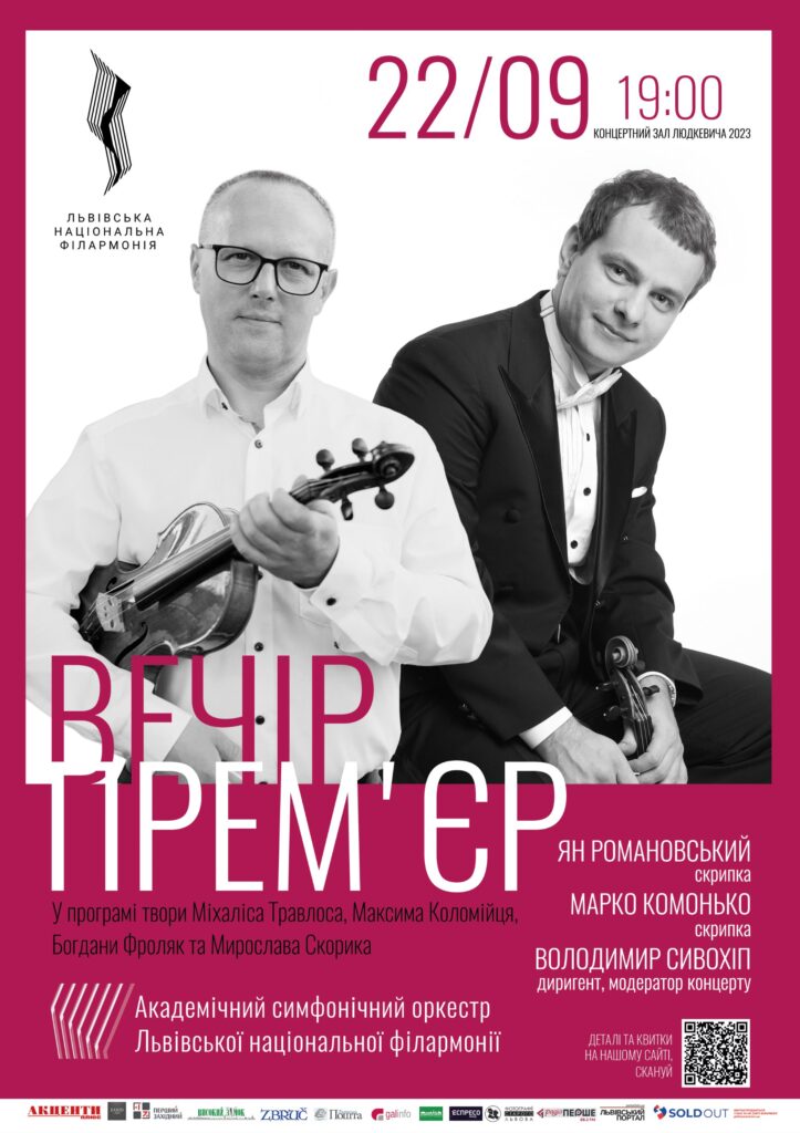 22 вересня Академічний симфонічний оркестр Львівської національної філармонії у тандемі з відомими солістами – Марком Комоньком та Яном Романовським виконають “Four Rivers” для двох скрипок і симфонічного оркестру Максима Коломійця. Диригуватиме Володимир Сивохіп.