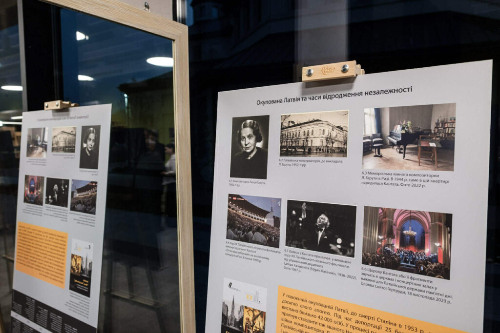Разом із фотографіями на першому поверсі Центру Шептицького розмістили банерну виставку, у якій розповідають історію країни під окупацією Радянського Союзу і гітлерівської Німеччини. Але головним її лейтмотивом є розповідь про кантату «Боже, пломенить земля!» поета Андрея Еглітіса та композиторки Люції Гаруту. Її у 1944 році створили як молитву до Бога, щоб зміцнити дух народу й дати йому сили пережити важкі часи. Після премʼєри в Ризі 15 березня 1944 р., вона миттєво здобула успіх, багато людей у Латвії знали її напам’ять і наспівували під час вечірніх молитов.