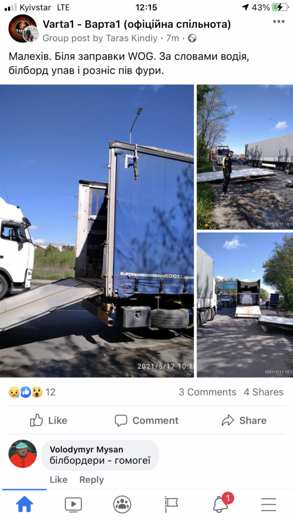 - У Малехові білборд впав на вантажівку, скрін повідомлення