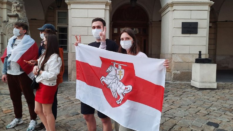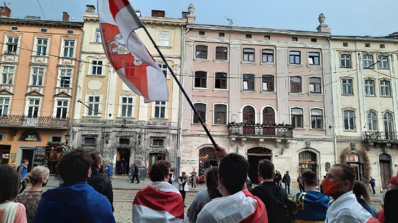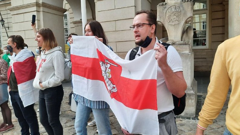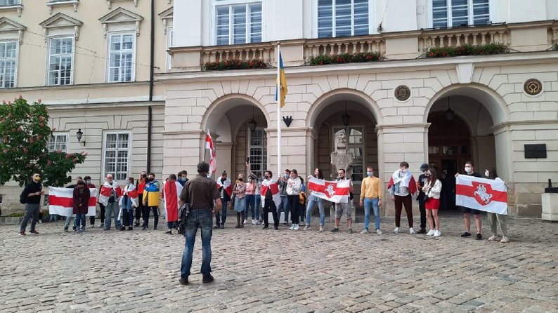 Білоруси, які переїхали до Львова, вийшли на акцію протесту проти режиму Лукашенка. Біля стін Ратуші зібралось близько 30 людей.