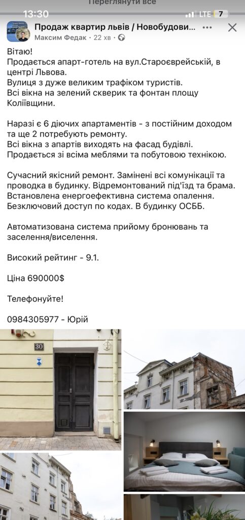 Наразі є 6 діючих апартаментів – з постійним доходом та ще 2 потребують ремонту.