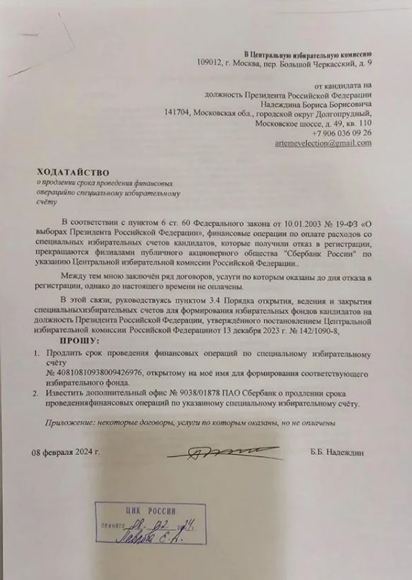 В особистому листуванні Надєждін активно контактує з представниками ЦВК РФ і розв’язує особисті та політичні питання, зокрема, після відмови в реєстрації як кандидата в президенти. Це, на думку хакерів, свідчить про ознаки «фіктивного кандидата в президенти».
