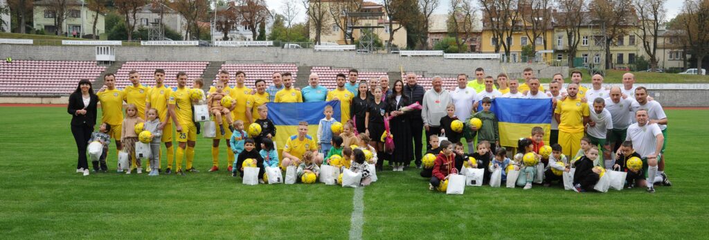 На початку благодійного матчу гравці команд-учасниць вручили діткам-сиротам професійну футбольну форму, спортивне спорядження та солодощі