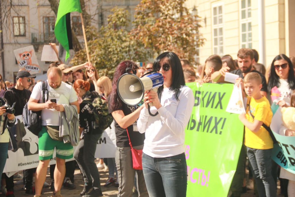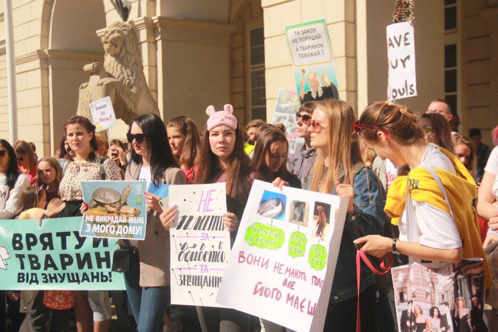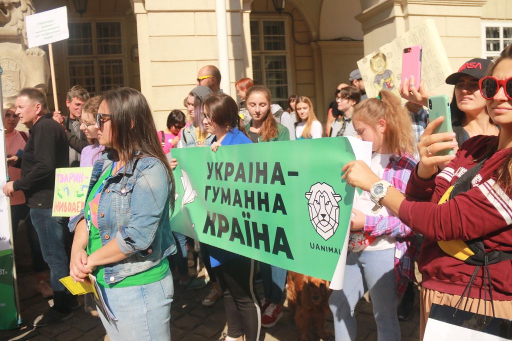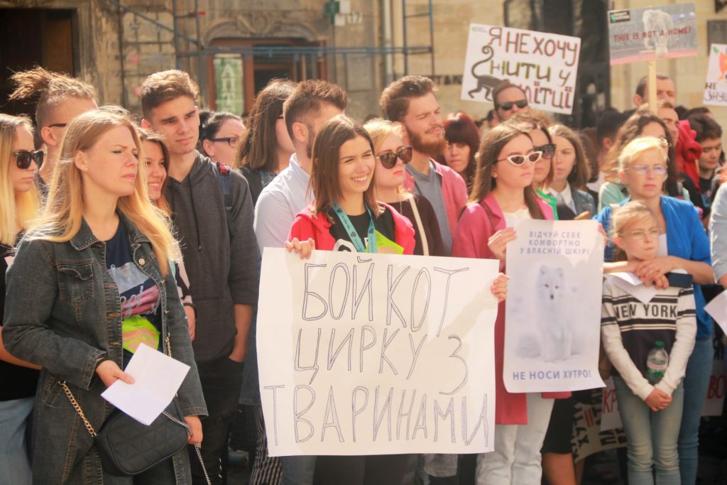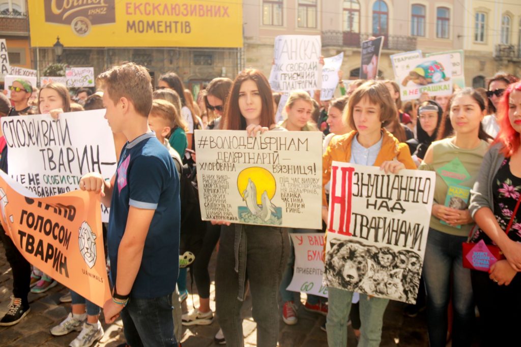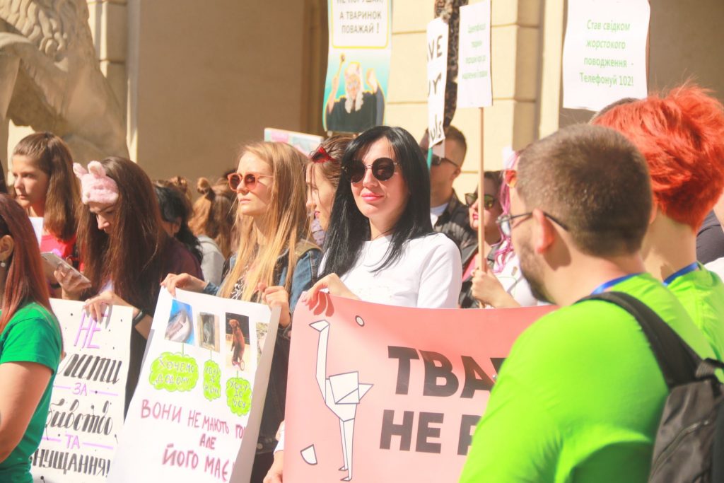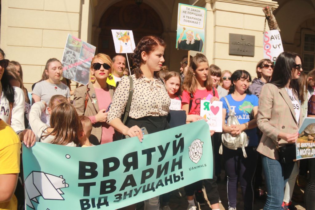 У Львові учасники акції на чолі з зоозахисницею Оксаною Джус вийшли на вулиці міста із 11-ма головними вимогами, серед яких – заборона використання тварин у цирках і дельфінаріях, заборона експлуатації тварин для жебракування і фотопослуг, заборона на створення і функціонування притравочних станцій.