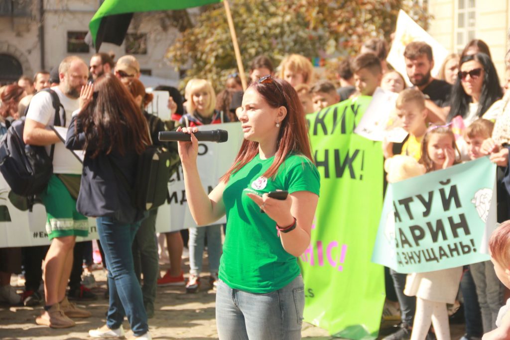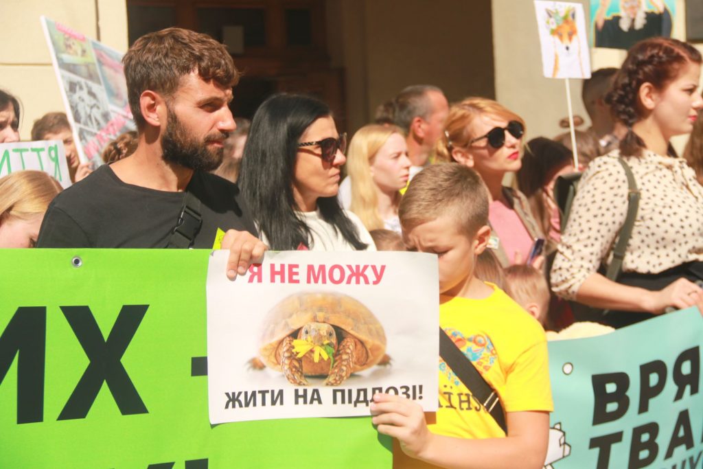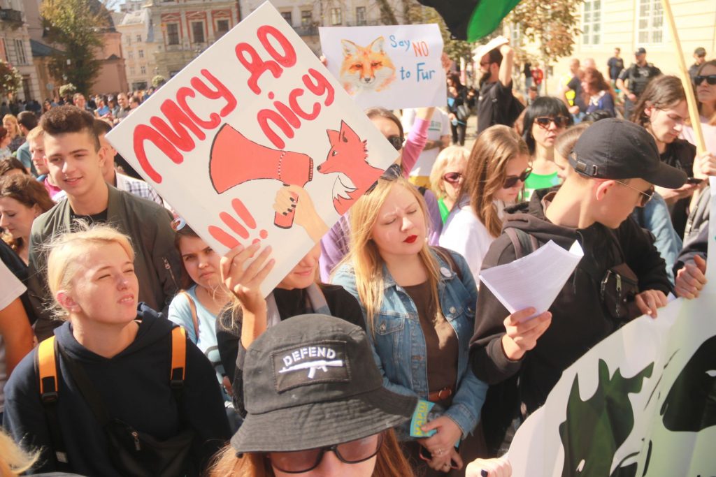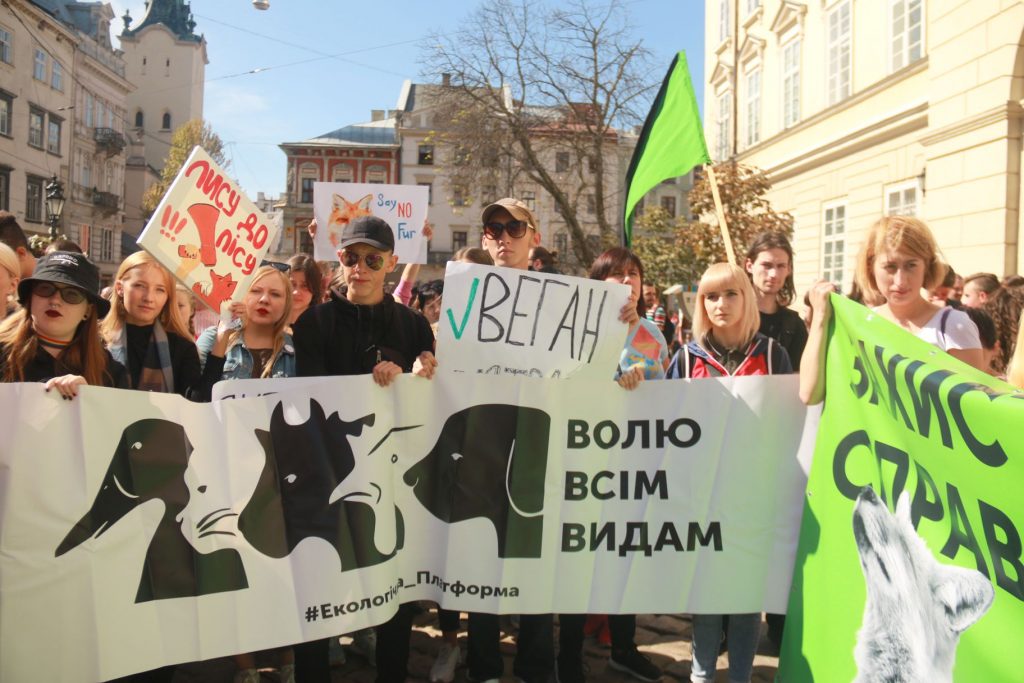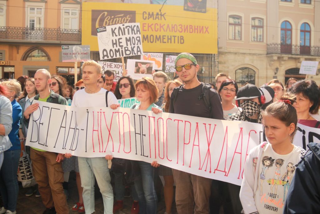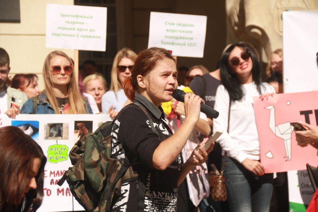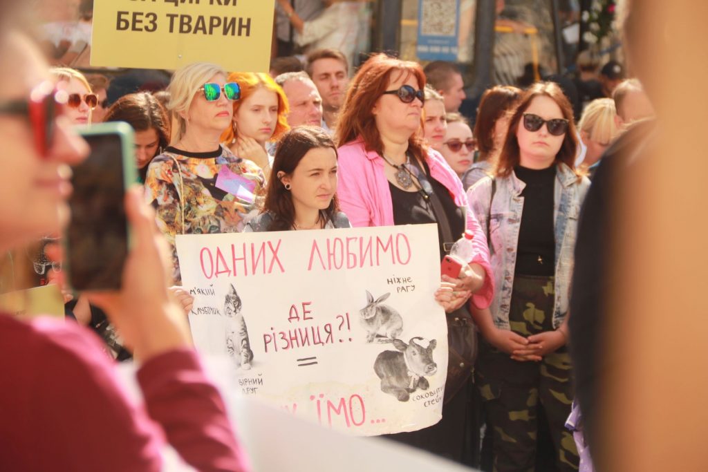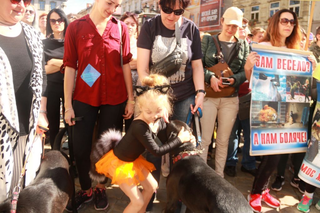 У Львові учасники акції на чолі з зоозахисницею Оксаною Джус вийшли на вулиці міста із 11-ма головними вимогами, серед яких – заборона використання тварин у цирках і дельфінаріях, заборона експлуатації тварин для жебракування і фотопослуг, заборона на створення і функціонування притравочних станцій.