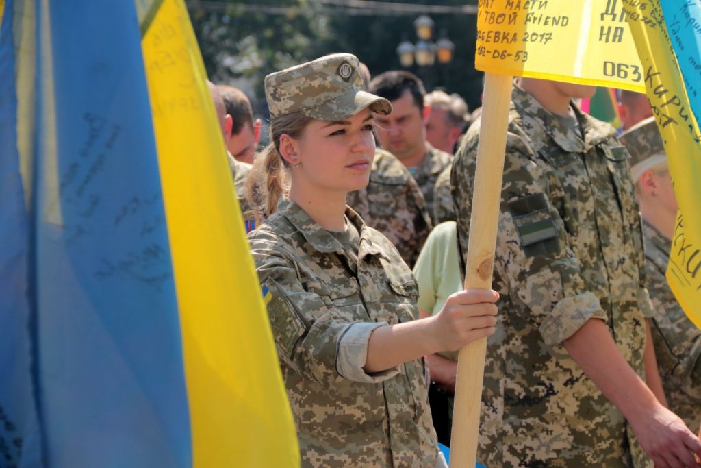 На площі перед пам’ятником Шевченку також вишикували прапори зі Сходу Україну – ті, які пройшли війну, із підписами бійців.