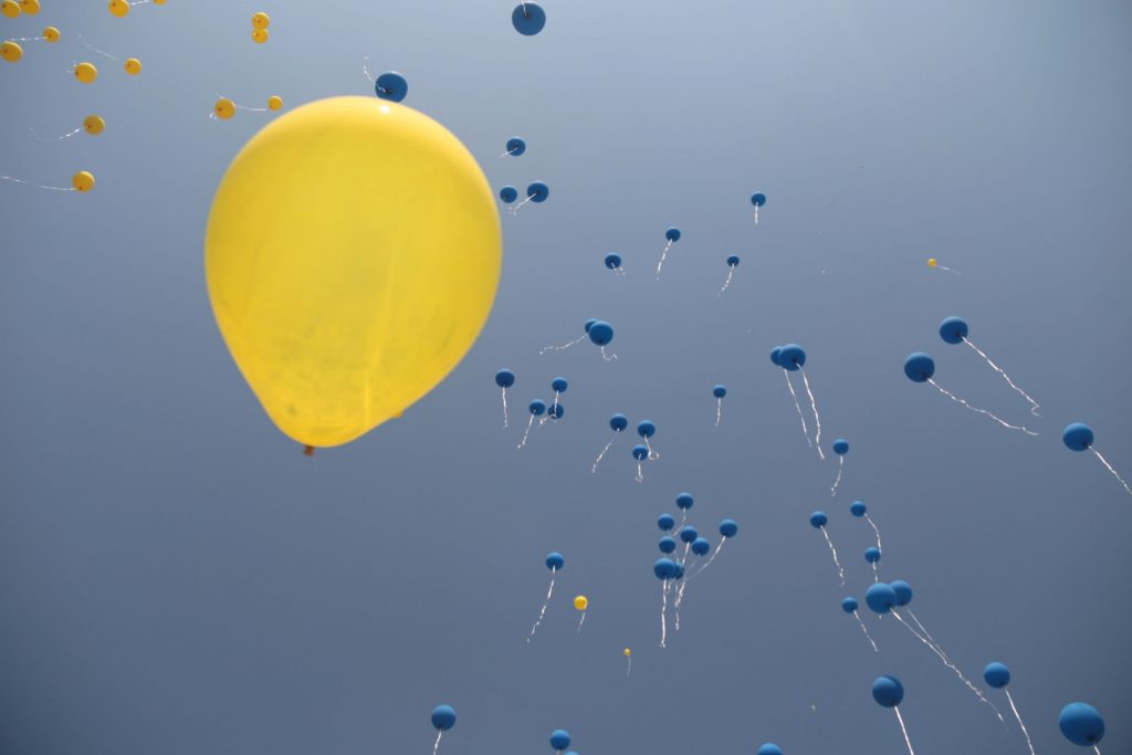 «Живий» синьо-жовтий прапор із повітряних кульок у формі України створили понад півтори тисячі учасників акції.