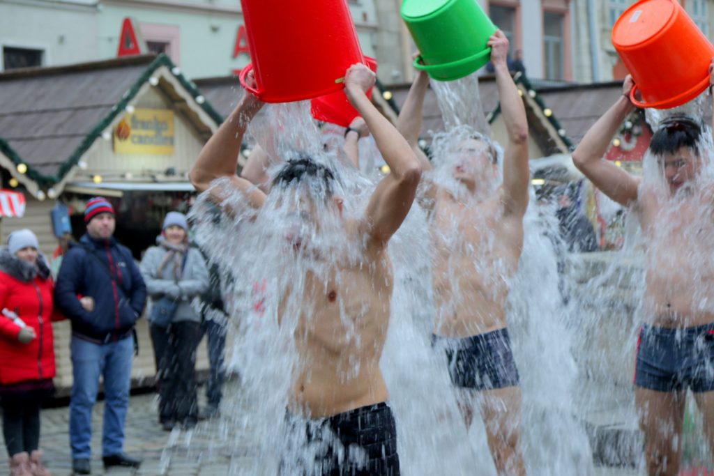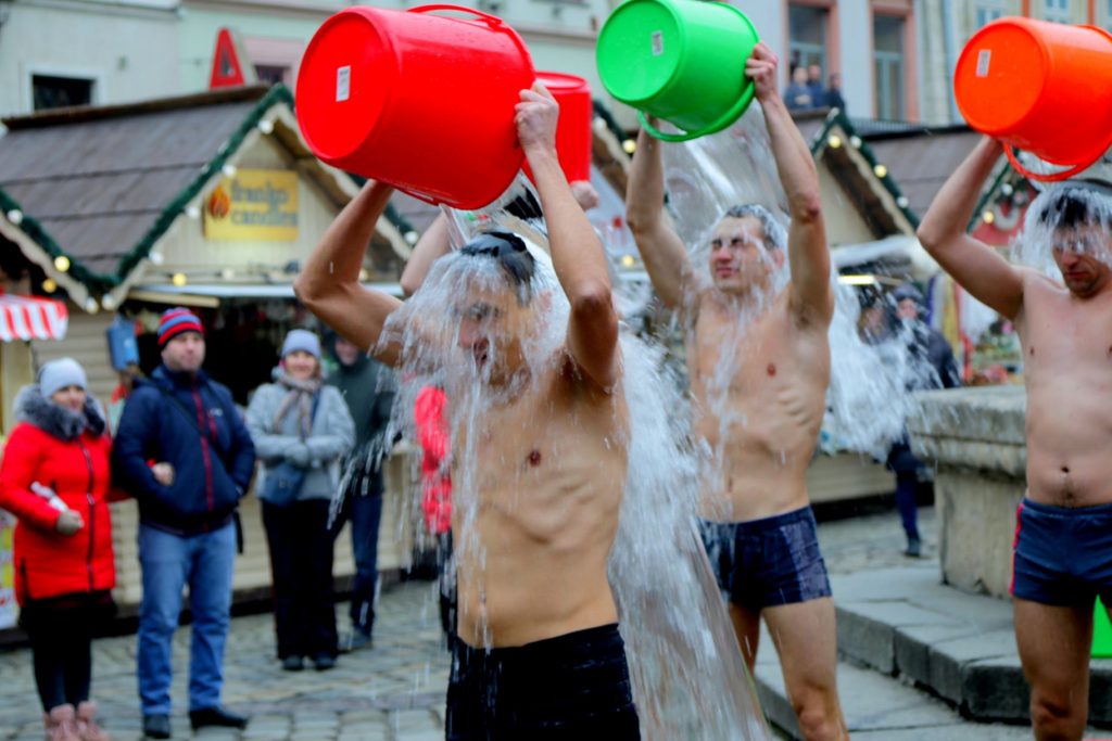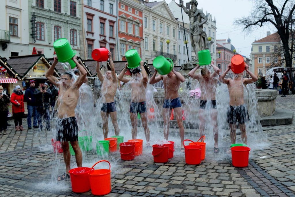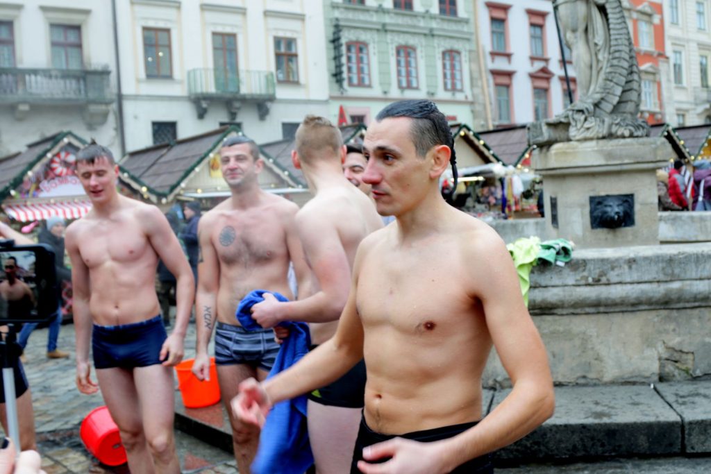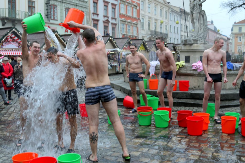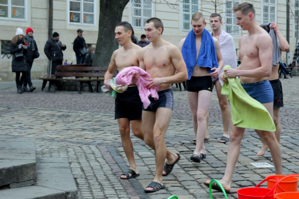 До дійства долучились кілька відчайдухів, які не побоялись пройти площею Ринок у спідній білизні та вилити на себе відро води.