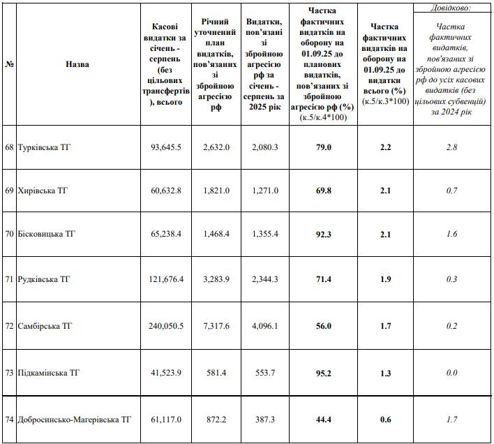 На жаль, традиційно низька частка видатків, пов’язаних зі збройною агресією рф у бюджетах Добросинсько-Мегерівської 0,6%, Самбірської – 1,7%, Підкамінської – 1,3%, Турківської – 2,2%, Новояричівської – 3,0%, Рудківської – 1,9%, Бісковицької –2,1% та інших громадах.