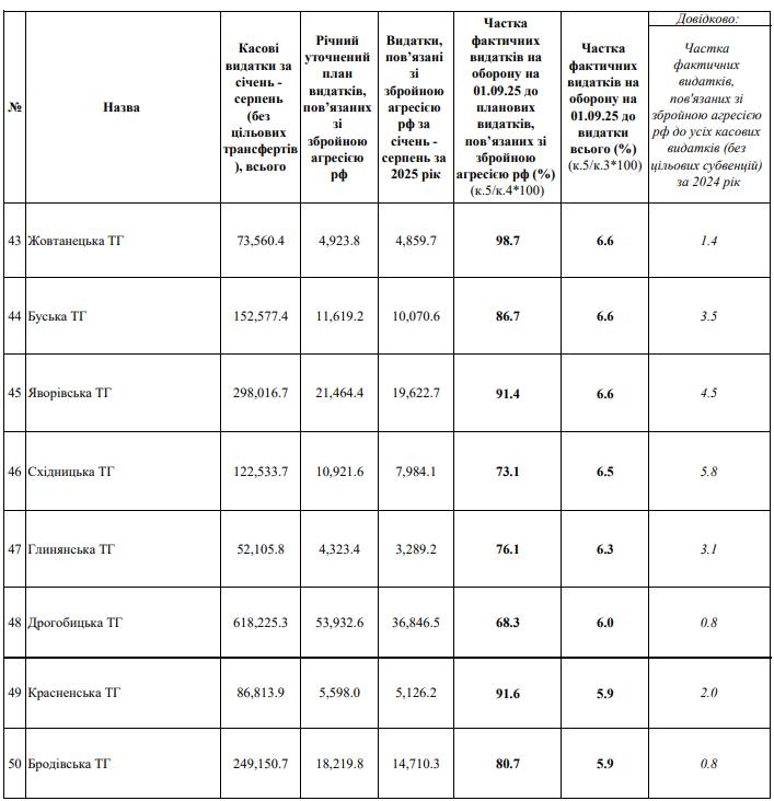 Особливо негативно на загальнообласні показники впливає низька частка видатків з бюджету Львівської громади, оскільки загалом фінансовий ресурс міського бюджету становить близько 38% обсягу усіх місцевих бюджетів області. За 8 місяців 2025 з бюджету Львівської громади на видатки, пов’язані зі збройною агресією рф, виділили 683,6 млн грн, що становить лише 7,7% від усього бюджету.