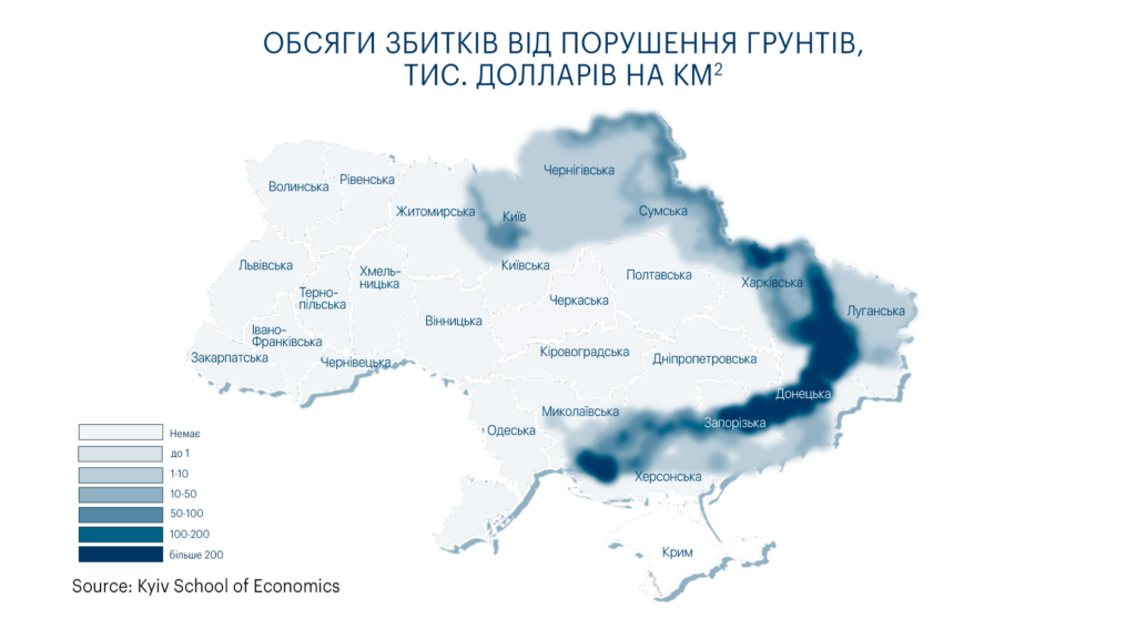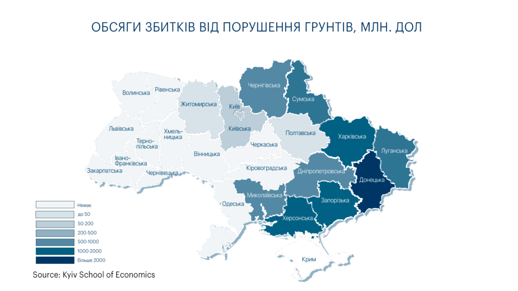 У цілому, загальні збитки від пошкодження територій та порушення ґрунтів внаслідок військових дій оцінюються в $9,8 мільярда. Це ставить під загрозу використання пошкоджених земель і вимагає проведення рекультивації, розмінування територій та знешкодження боєприпасів.