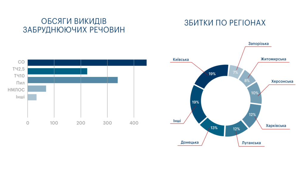 Україна з початку війни стикається зі значними наслідками бойових дій, які призвели не тільки до прямих руйнувань та економічних втрат, а ще й вплинули на стан навколишнього середовища та призвели до значних викидів забруднюючих речовин у повітря. Наслідки цих викидів виявилися катастрофічними, загальні збитки вже сягнули практично $4,2 млрд. Зокрема, $1,8 млрд становить шкода від лісових пожеж, $1,6 млрд — від трав’яних пожеж та $752 млн – від горіння нафти та нафтопродуктів. Ця сума наразі не враховує прямі збитки, завдані внаслідок підриву російськими окупантами Каховської ГЕС на Херсонщині 6 червня 2023 року.