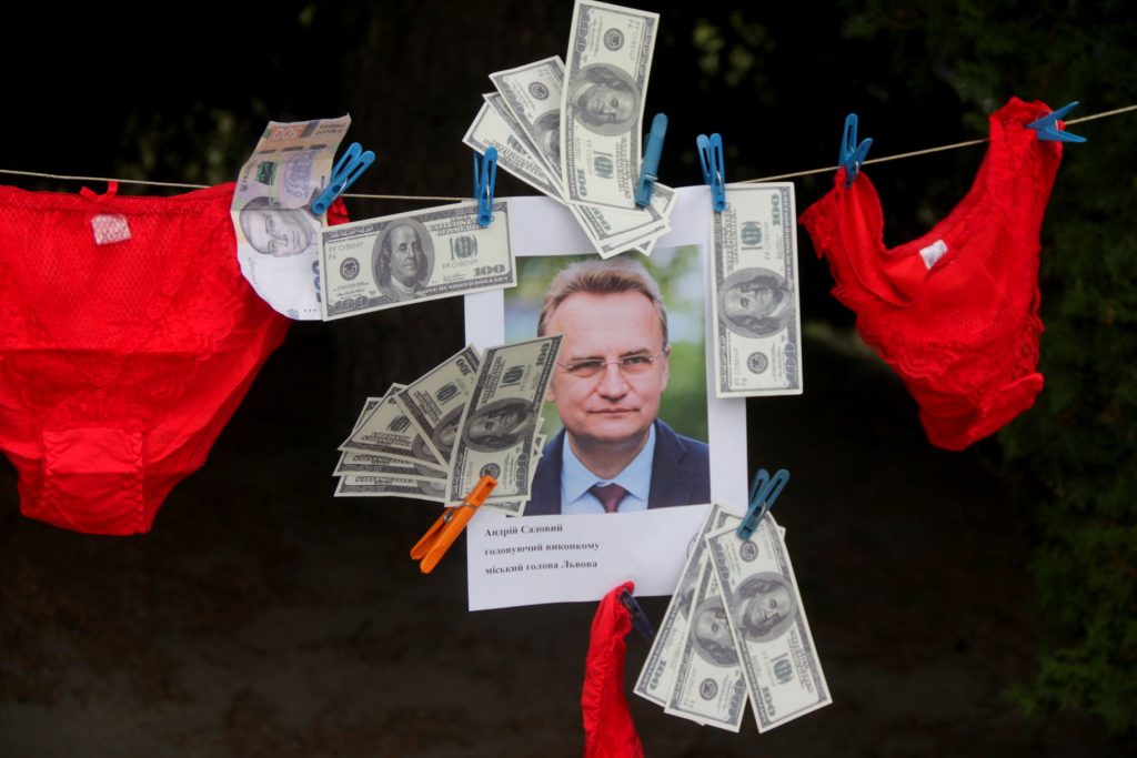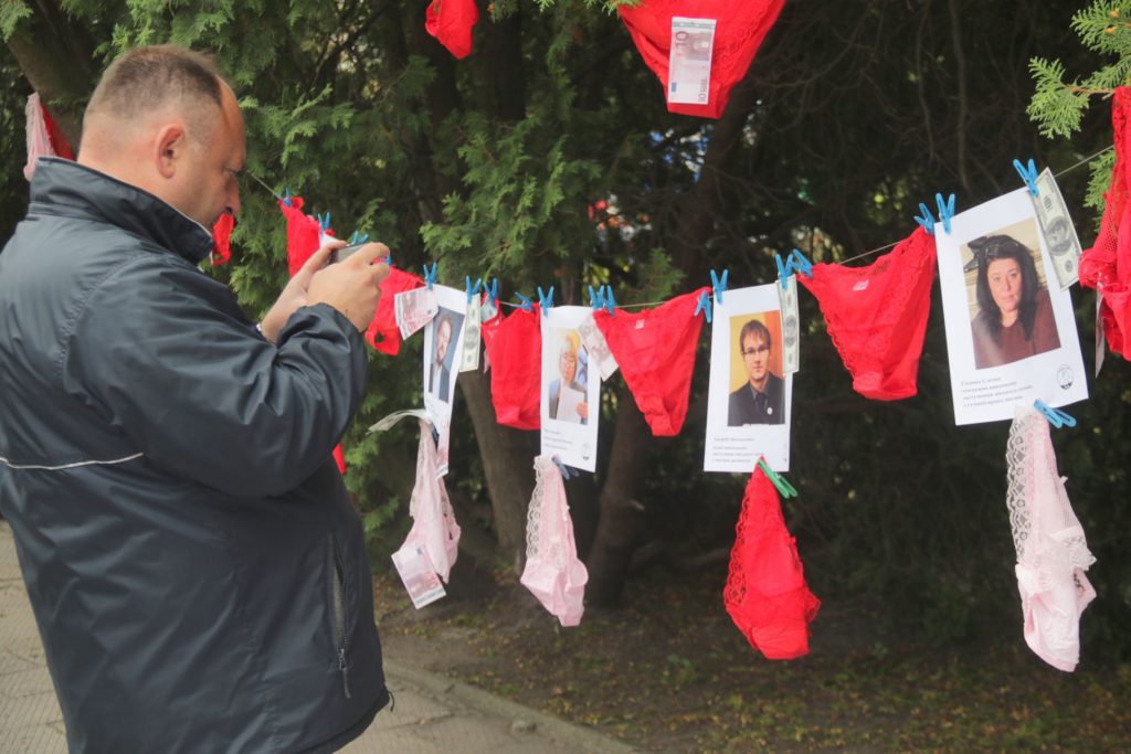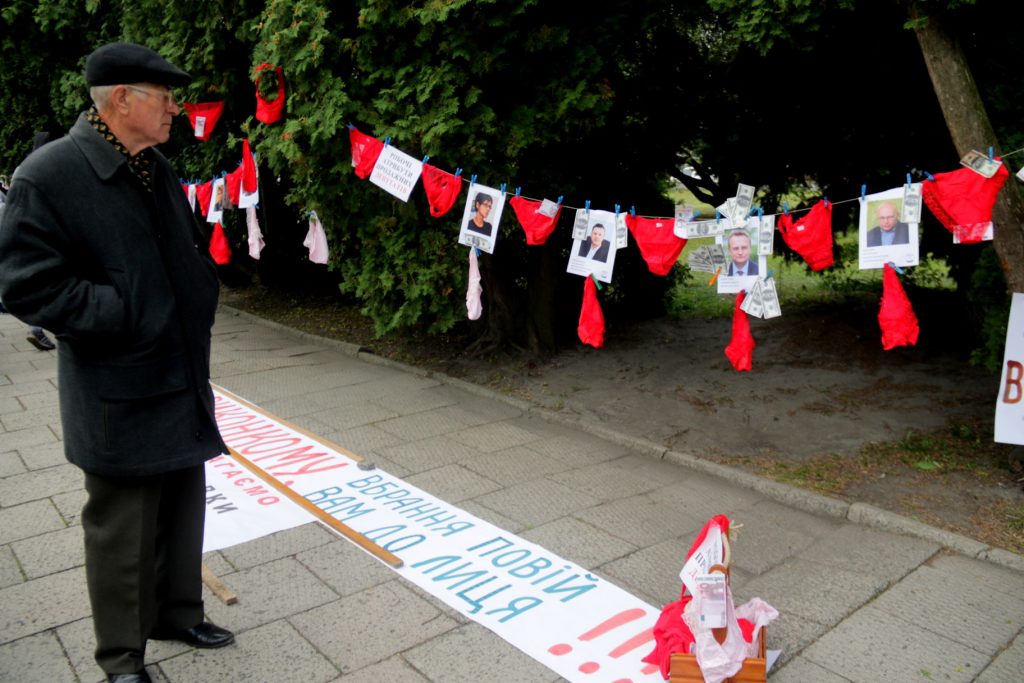 Так, активісти влаштували цілий перфоманс: розвісили на площі перед входом жіночу білизну, фото депутатів, муляжні купюри та били в барабани.