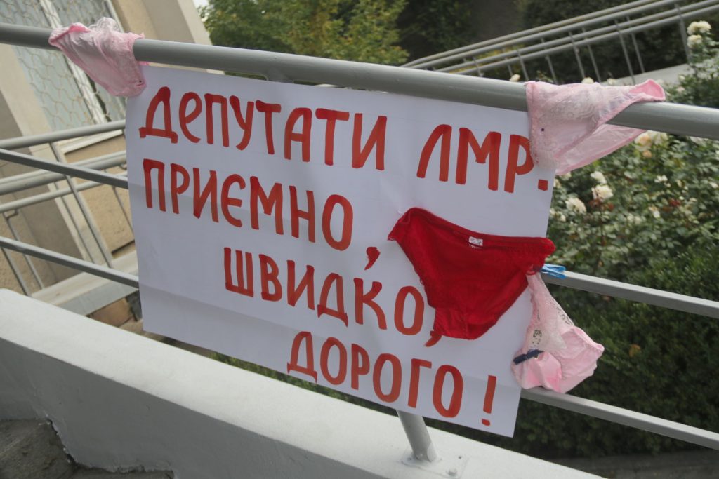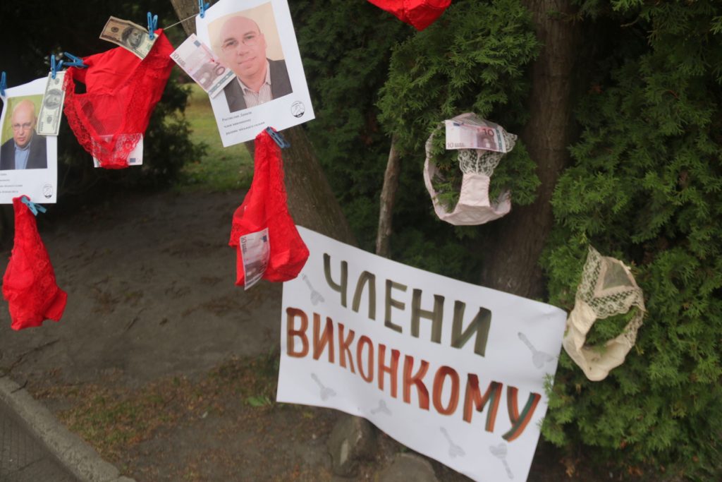 Активісти принесли з собою масштабний банер з провокативним гаслом: “Члени виконкому, вбрання повій вам до лиця!”