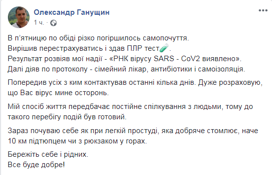 “В п’ятницю по обіді різко погіршилось самопочуття. Вирішив перестрахуватись і здав ПЛР тест. Результат розвіяв мої надії – «РНК вірусу SARS – CoV2 виявлено». Далі діяв по протоколу – сімейний лікар, антибіотики і самоізоляція. Попередив усіх з ким контактував останні кілька днів. Дуже розраховую, що Вас вірус мине осторонь. Мій спосіб життя передбачає постійне спілкування з людьми, тому до такого перебігу подій був готовий. Зараз почуваю себе як при легкій простуді, яка добряче стомлює, наче 10 км підтюпцем чи з рюкзаком у горах. Бережіть себе і рідних. Все буде добре!”,- зазначив у дописі Олександр Ганущин.