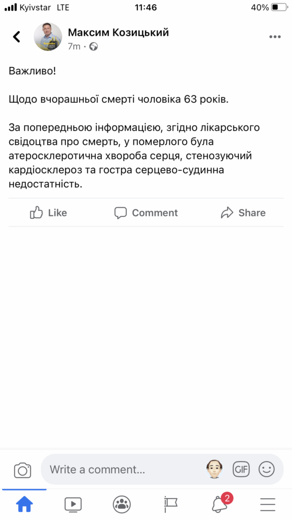 За попередньою інформацією, згідно лікарського свідоцтва про смерть, у померлого була атеросклеротична хвороба серця, cтенозуючий кардіосклероз та гостра серцево-судинна недостатність», – йдеться у повідомленні.