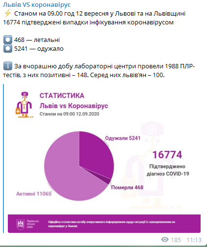 Як повідомлялося, станом на 08.00 год 11 вересня, на Львівщині 16626 підтверджених випадків інфікування коронавірусом, 462 — летальні. За попередню добу лабораторні центри провели 1334 ПЛР-тести, з яких 174 – позитивні результати. Серед них – 85 мешканців Львова.