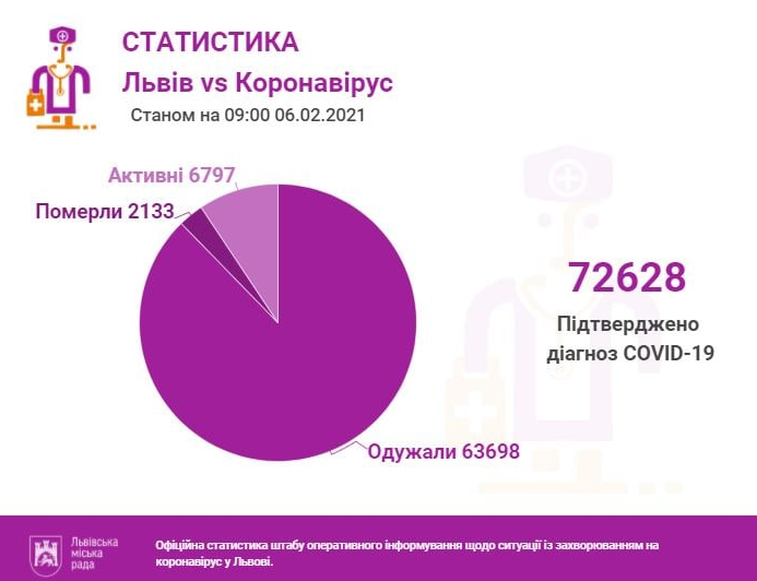 У Львівській області, станом на 09.00 год 6 лютого, 72628 підтверджених випадків інфікування коронавірусом, 2133 — летальні, 63698 — одужало.
