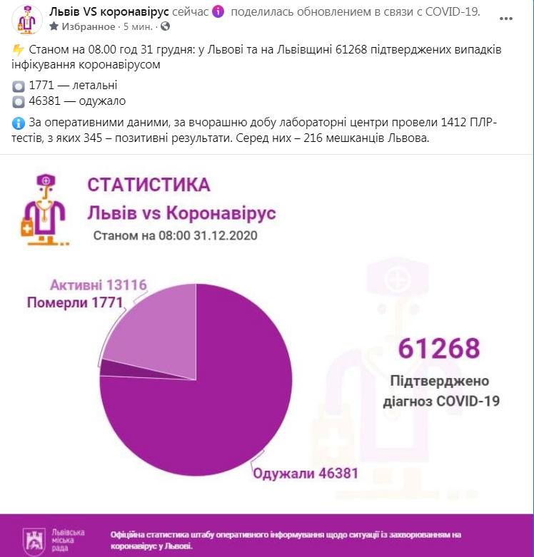 У Львівській області, станом на 08.00 год 31 грудня, 61268 підтверджених випадків інфікування коронавірусом, 1771 — летальні, 46381 — одужало.
