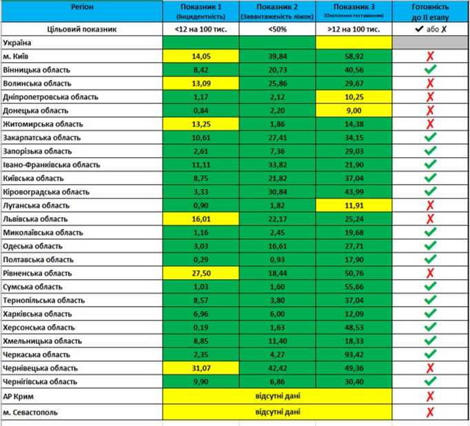 Згідно з даними, поки не готові до послаблення карантину м. Київ, Волинська, Дніпропетровська, Донецька, Житомирська, Луганська, Львівська, Рівненська та Чернівецька області.