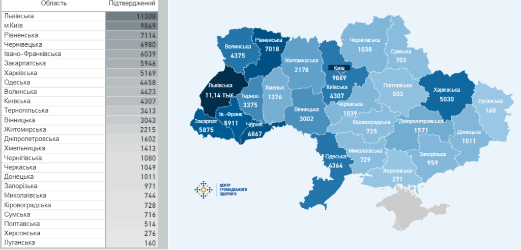 Найбільша кількість активних хворих на 100 тисяч населення зареєстрована у Львівській області