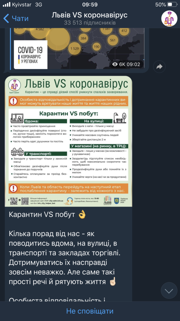 Телеграм-канал впровадили у мерії після запровадження в Україні пандемії коронавірусу. Там публікують інформацію, яку згодом за бюджетні кошти на дорогому друці розповсюджують через мережу комунальних підприємств міста Львова.