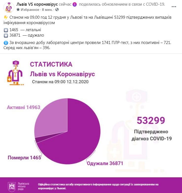 У Львівській області, станом на 09.00 год 12 грудня, 53299 підтверджених випадків інфікування коронавірусом, 1465 — летальні, 36871 — одужало.